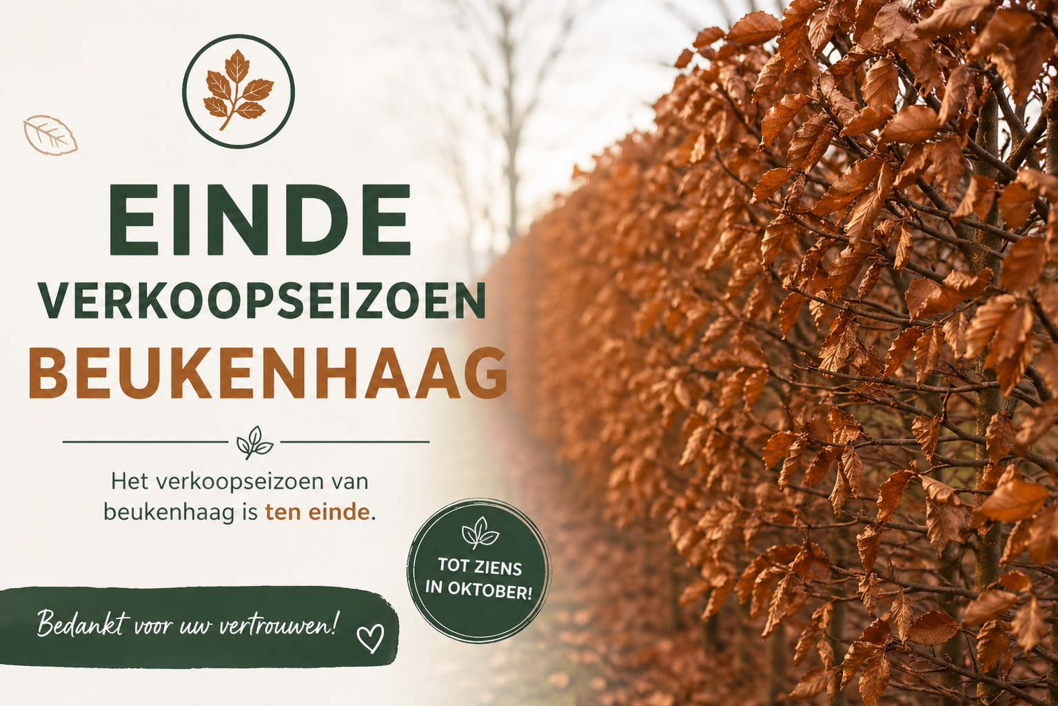 Beukenhaagkopen.be is een website opgezet door boomkwekerij Daamen. Vanaf half september 2025 nemen Annemiek en Michel Jongenelen van Jongenelen Plants het stokje over en kunnen Kees en José Daamen gaan genieten van een welverdiend pensioen.